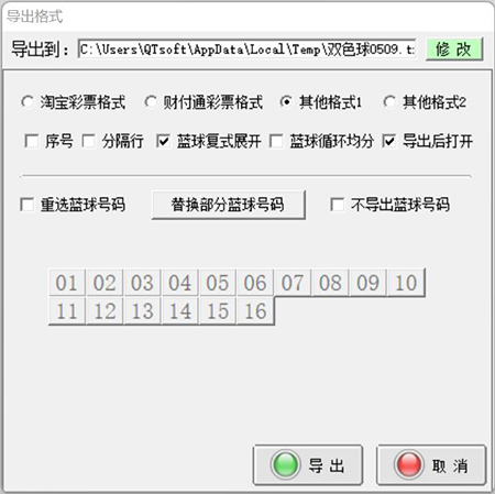 功能:按照选定的格式导出表格中的号码到文本文件,以方便用户保存数据或者网上投注。